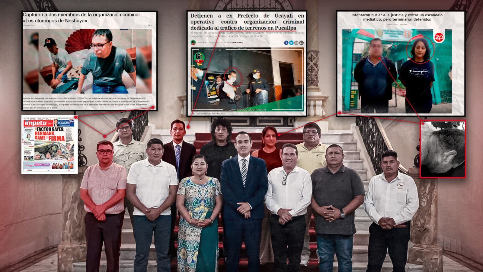 El caso más sensible fue el de Florencio Galarza Pardavé, actual gerente municipal de Irazola. Galarza fue detenido en 2024 en el marco del caso Neshuya, investigación fiscal por presunta organización criminal (Los otorongos de Neshuya) y colusión agravada vinculada a contrataciones públicas direccionadas. En ese expediente aparece como operador y beneficiario de adjudicaciones municipales, además de presunto financiador de campaña que, según la hipótesis fiscal, habría sido luego favorecido con contratos. Tras su detención, recuperó la libertad al acogerse a la condición de aspirante a colaborador eficaz. Ayer reapareció sentado en Palacio, participó de la reunión y posó en la foto oficial, pese a mantener antecedentes penales recientes aún bajo investigación.