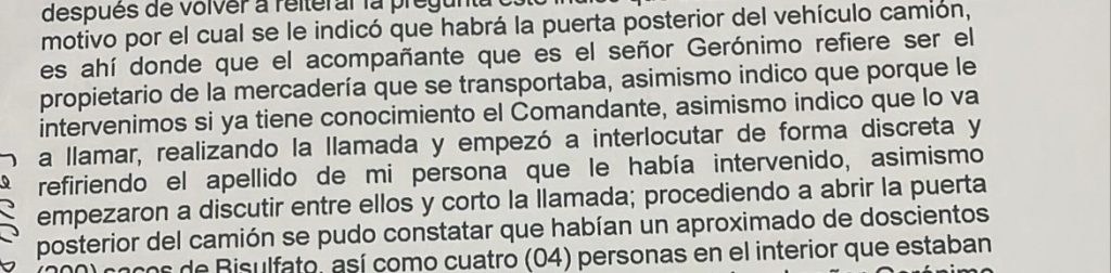 La inspección del vehículo confirmó la sospecha: en la parte posterior se hallaron los 200 sacos de bisulfato de sodio, un insumo no controlado, pero usualmente empleado como sustituto en la elaboración de pasta básica de cocaína. Sentadas sobre la carga fueron intervenidas cuatro personas adicionales: Cleider Guerra Chistama, Richard Guerra Chistama, Caleb Noriega Ahuanari y Gregorio Isuiza Ramírez.
