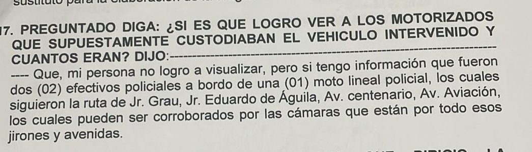 Los agentes de «Los Capibaras» declararon ante el Ministerio Público que el vehículo pesado era custodiado por dos agentes motorizados de la PNP. Estos uniformados habrían escoltado el camión por las calles Jr. Miguel Grau, Jr. Eduardo del Águila, Av. Centenario y Av. Aviación.